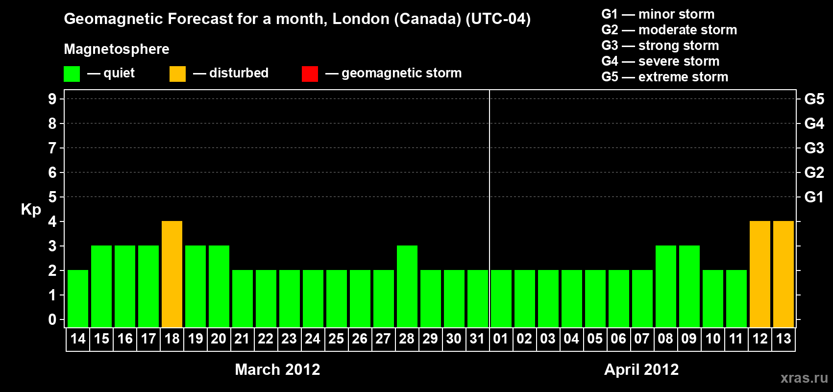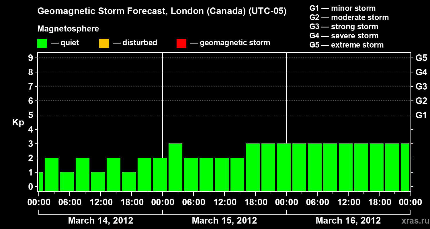 Geomagnetic storm forecast in London (Canada) for Mar 14, 2012