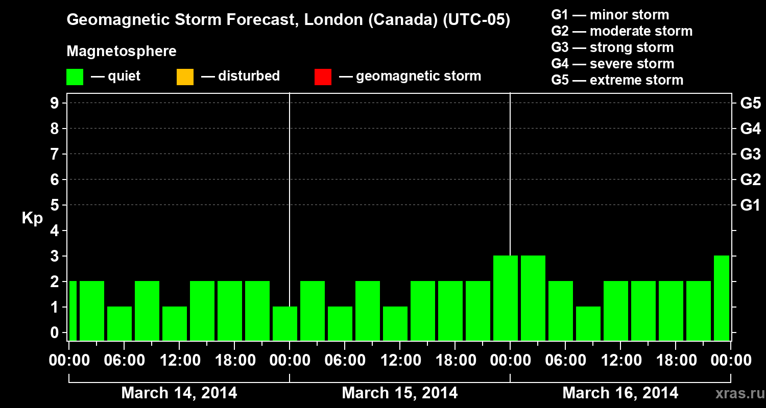 Geomagnetic storm forecast in London (Canada) for Mar 14, 2014