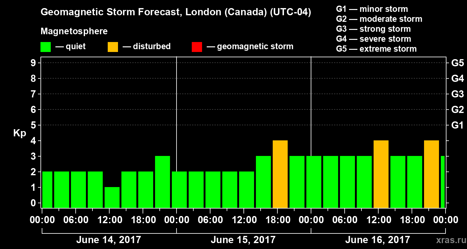Geomagnetic storm forecast in London (Canada) for Jun 14, 2017