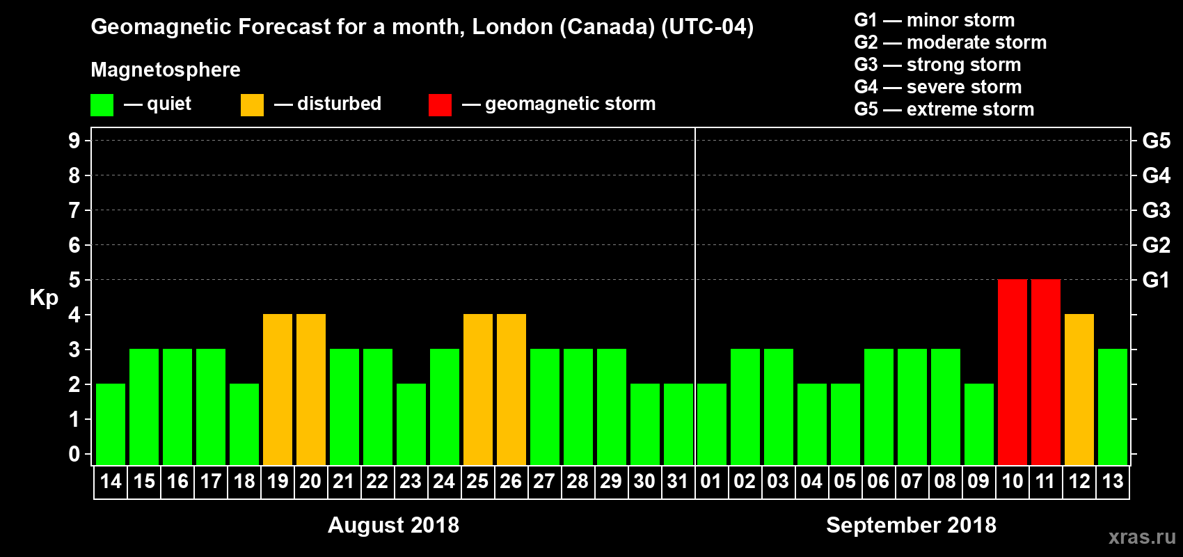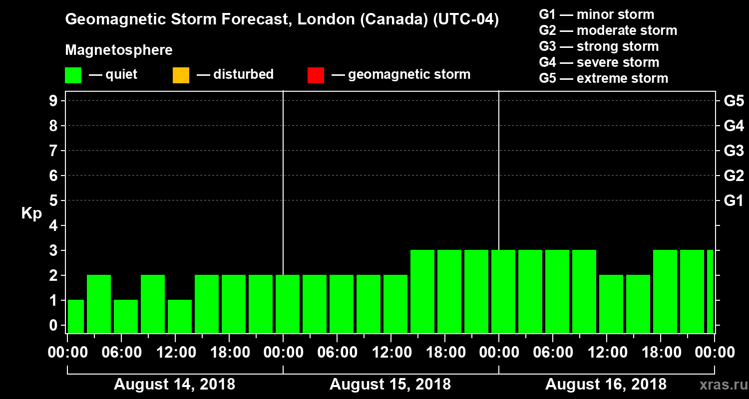 Geomagnetic storm forecast in London (Canada) for Aug 14, 2018