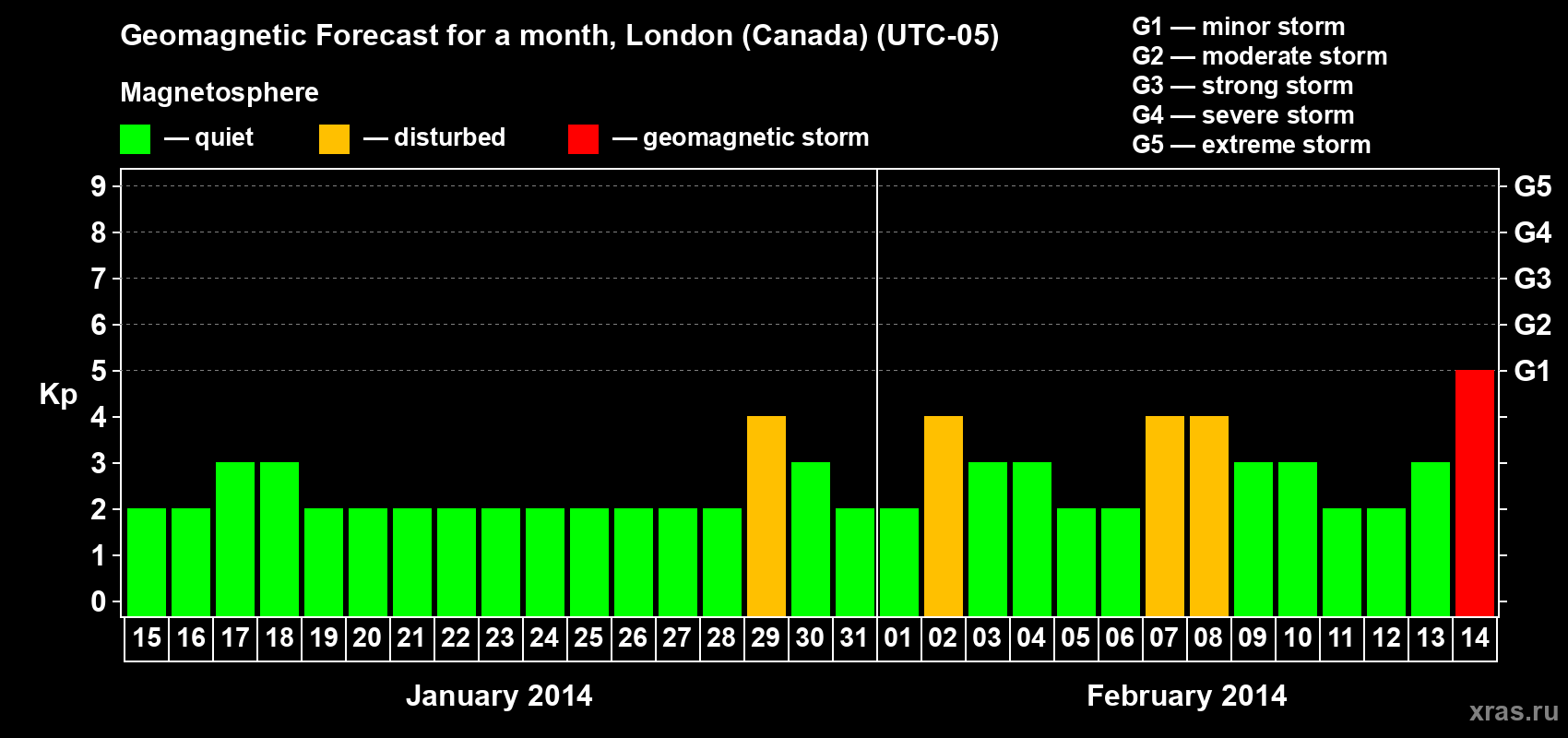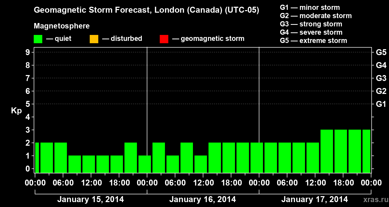 Geomagnetic storm forecast in London (Canada) for Jan 15, 2014