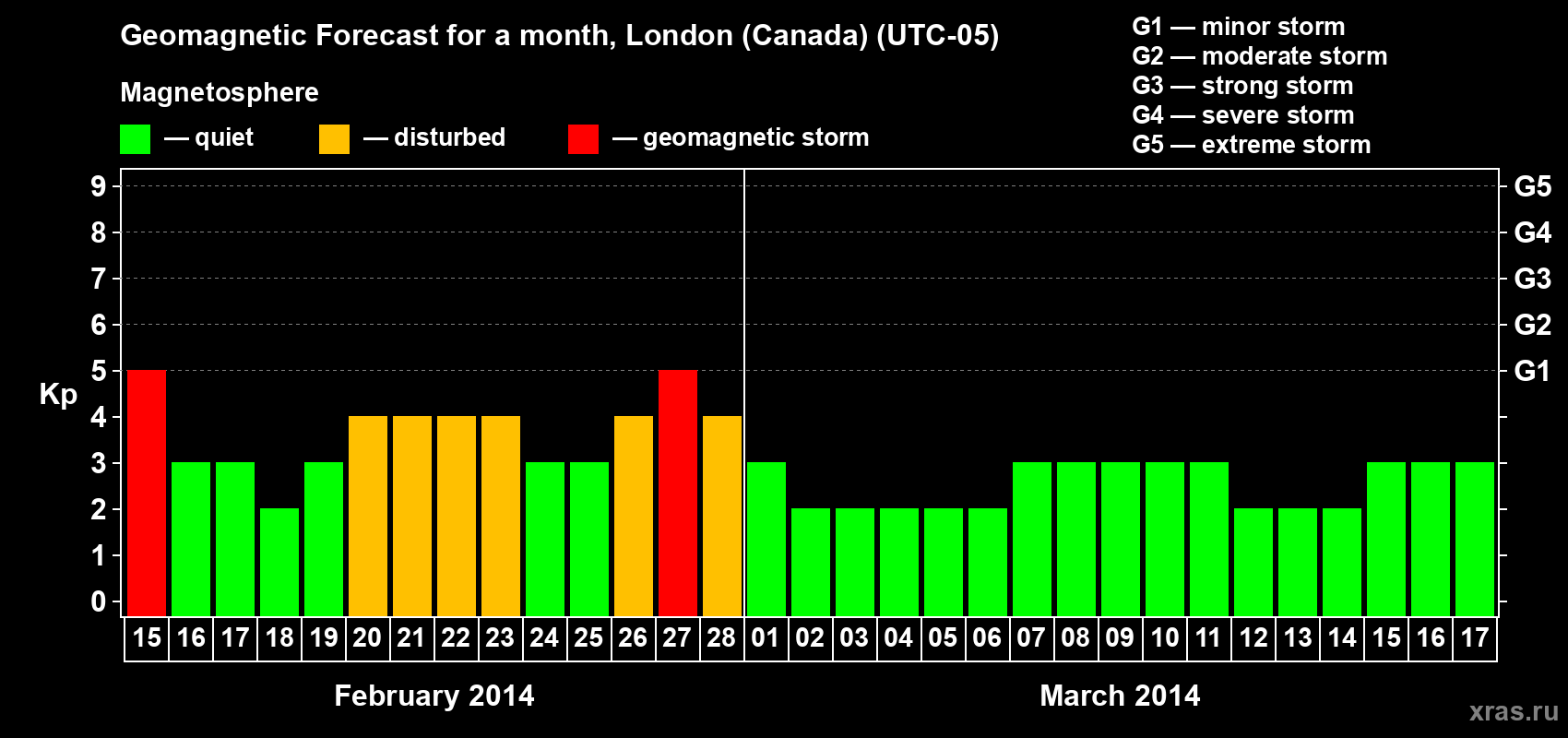 Geomagnetic storm forecast in London (Canada) for Feb 15, 2014