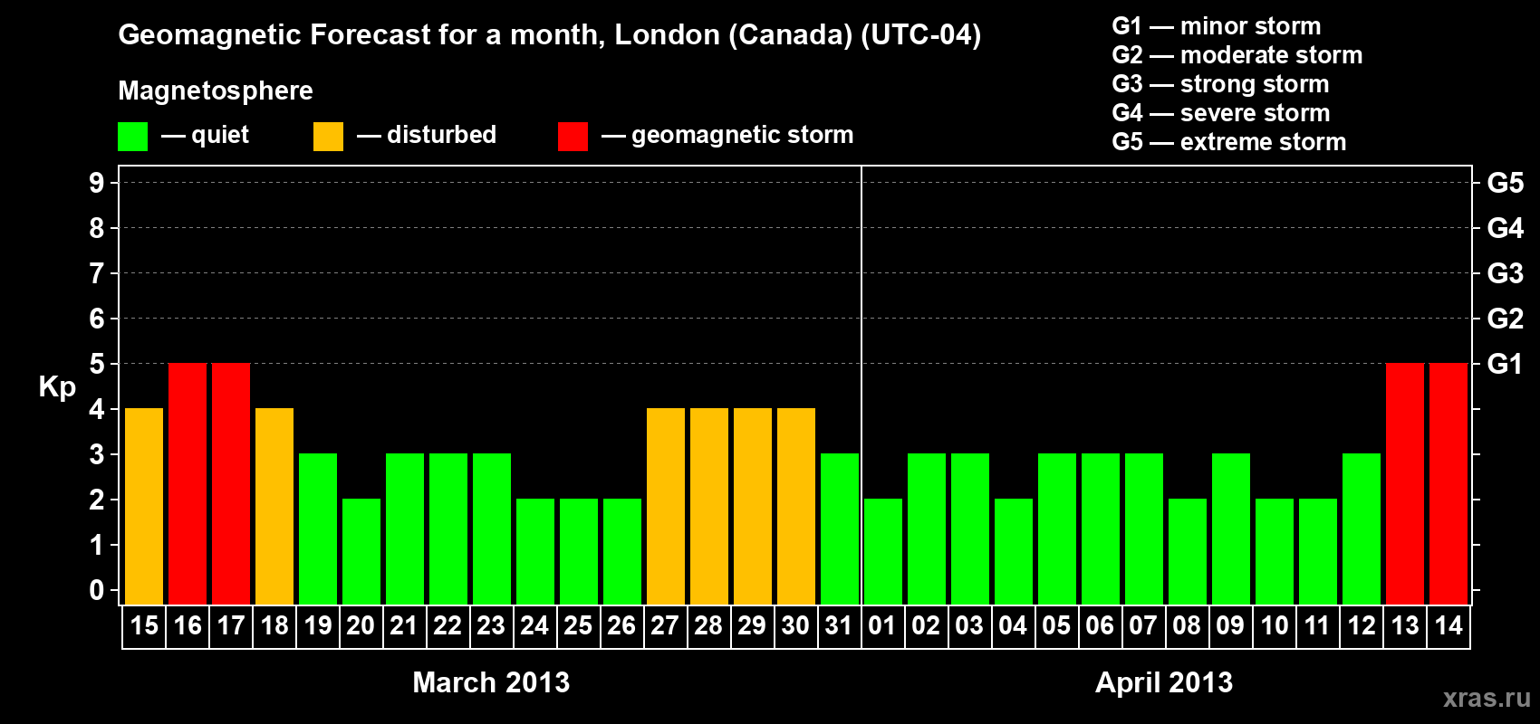 Geomagnetic storm forecast in London (Canada) for Mar 15, 2013