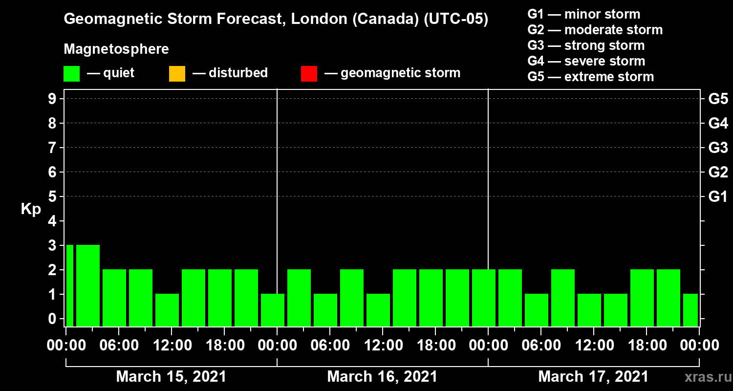 Geomagnetic storm forecast in London (Canada) for Mar 15, 2021