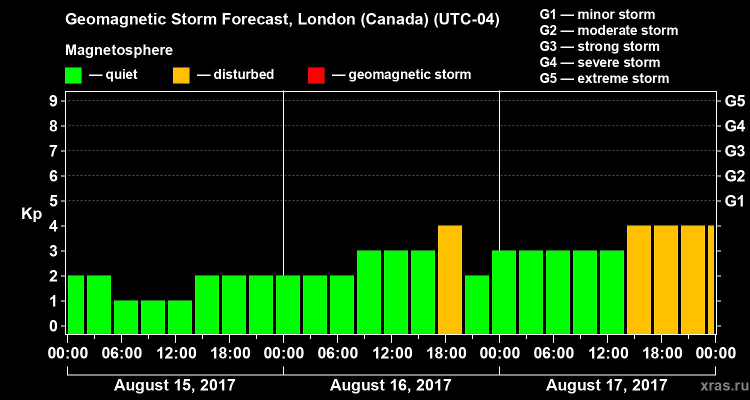 Geomagnetic storm forecast in London (Canada) for Aug 15, 2017