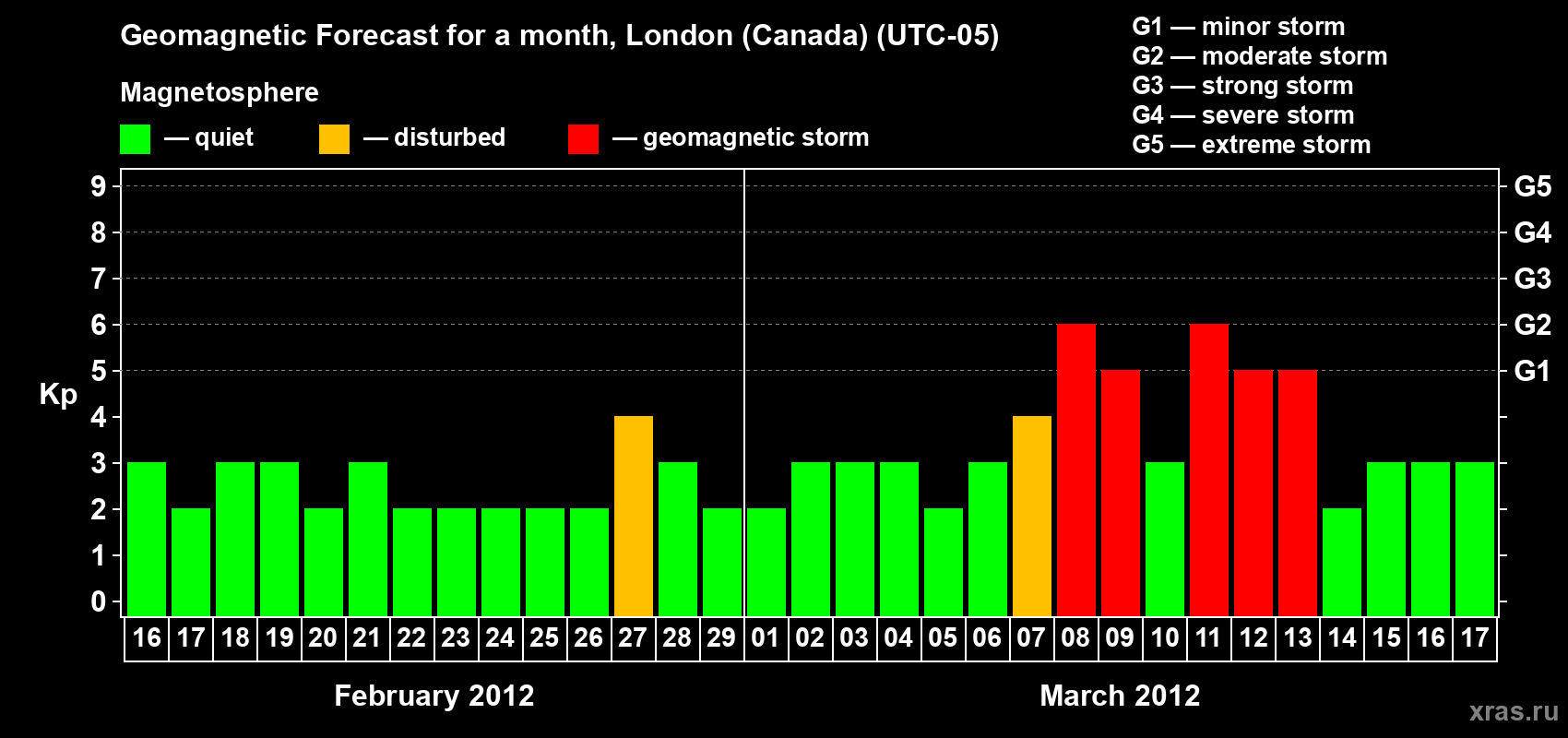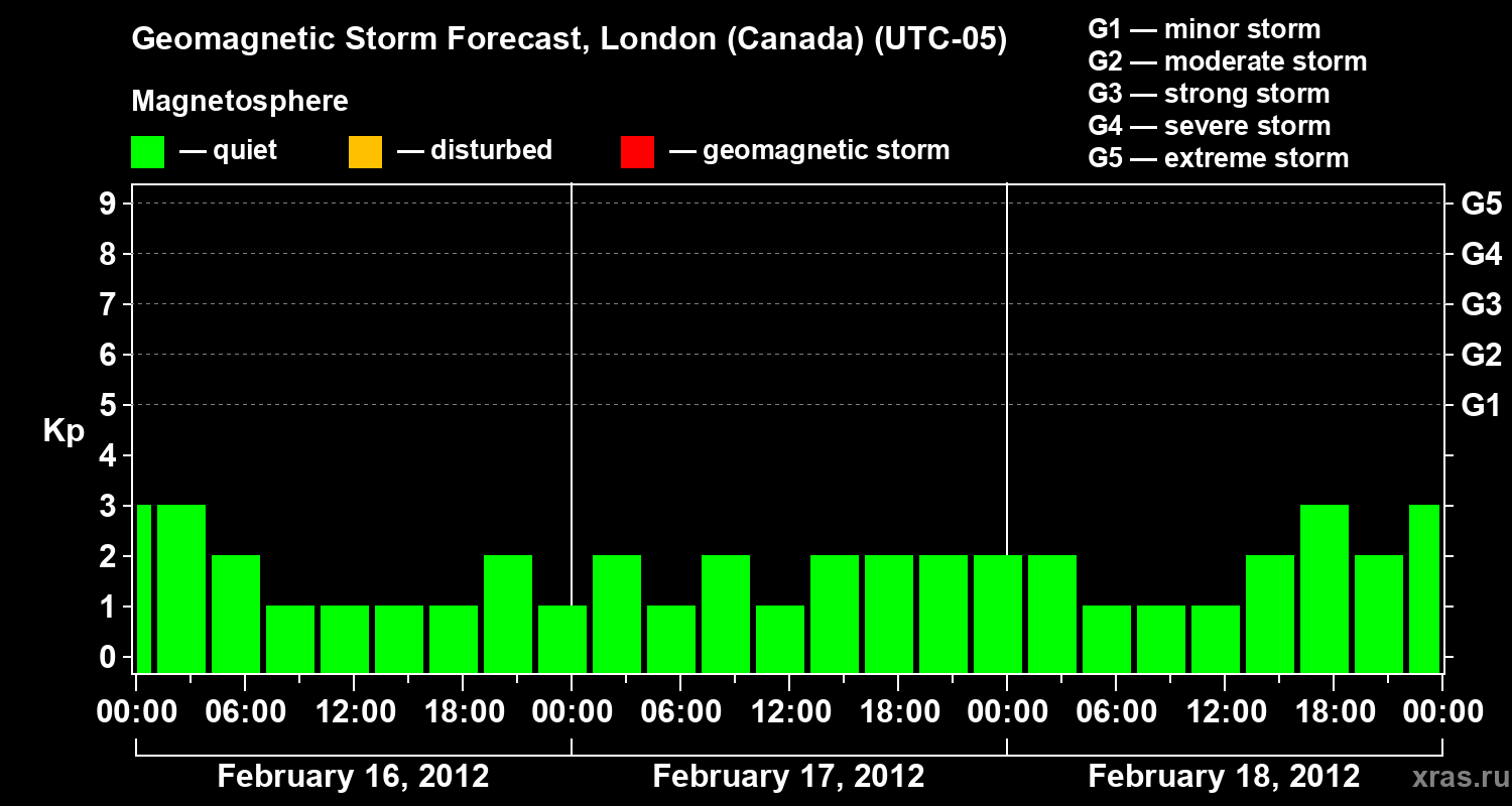 Geomagnetic storm forecast in London (Canada) for Feb 16, 2012
