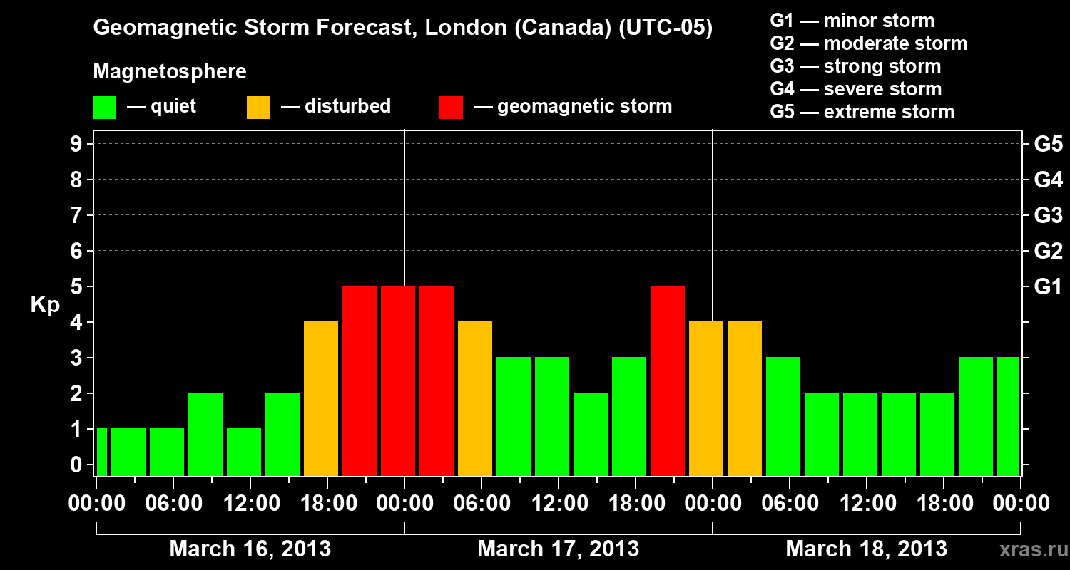 Geomagnetic storm forecast in London (Canada) for Mar 16, 2013