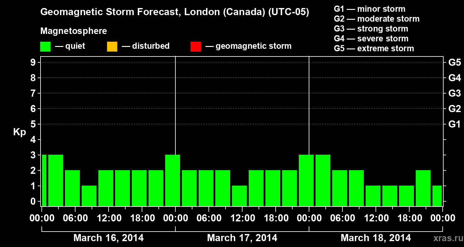Geomagnetic storm forecast in London (Canada) for Mar 16, 2014