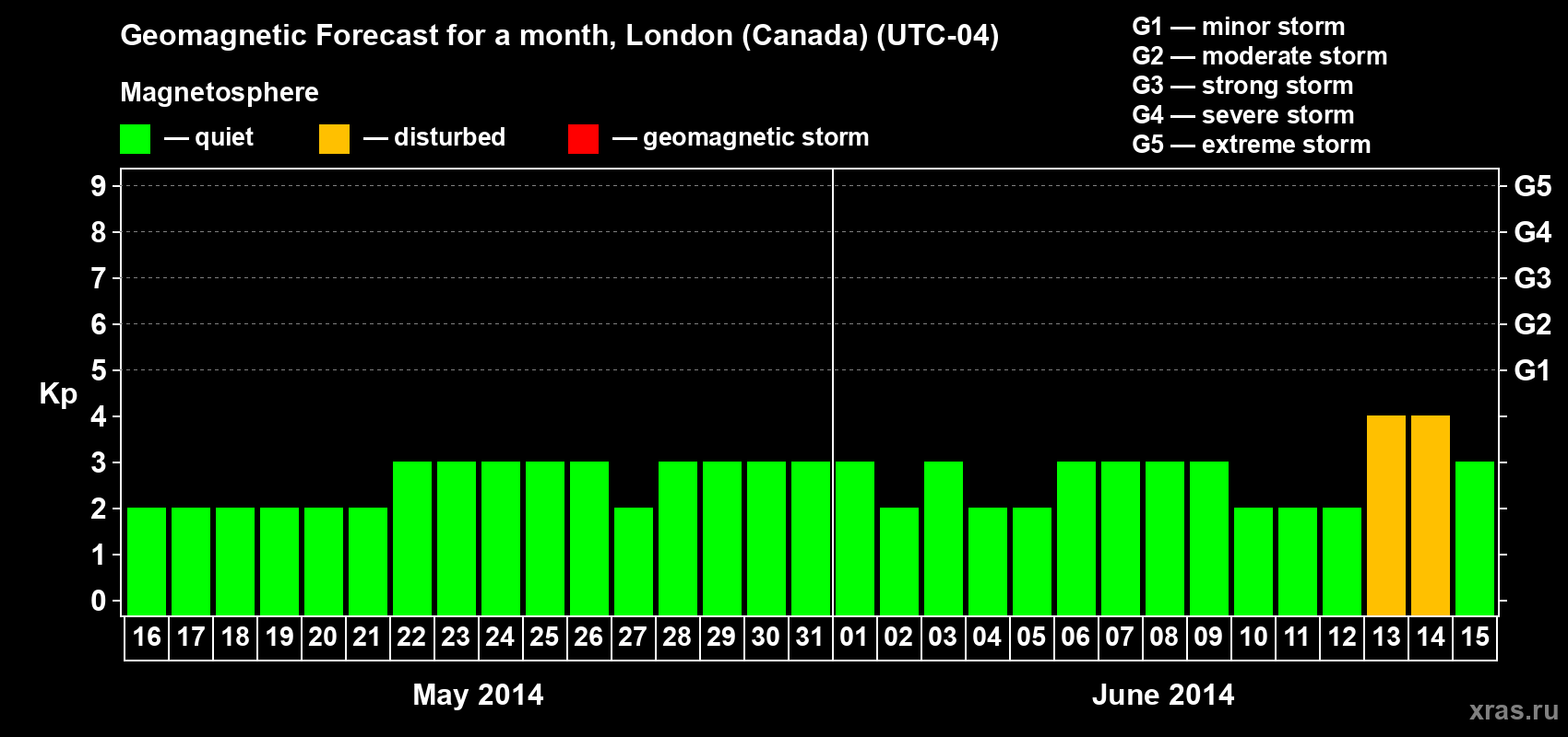 Geomagnetic storm forecast in London (Canada) for May 16, 2014