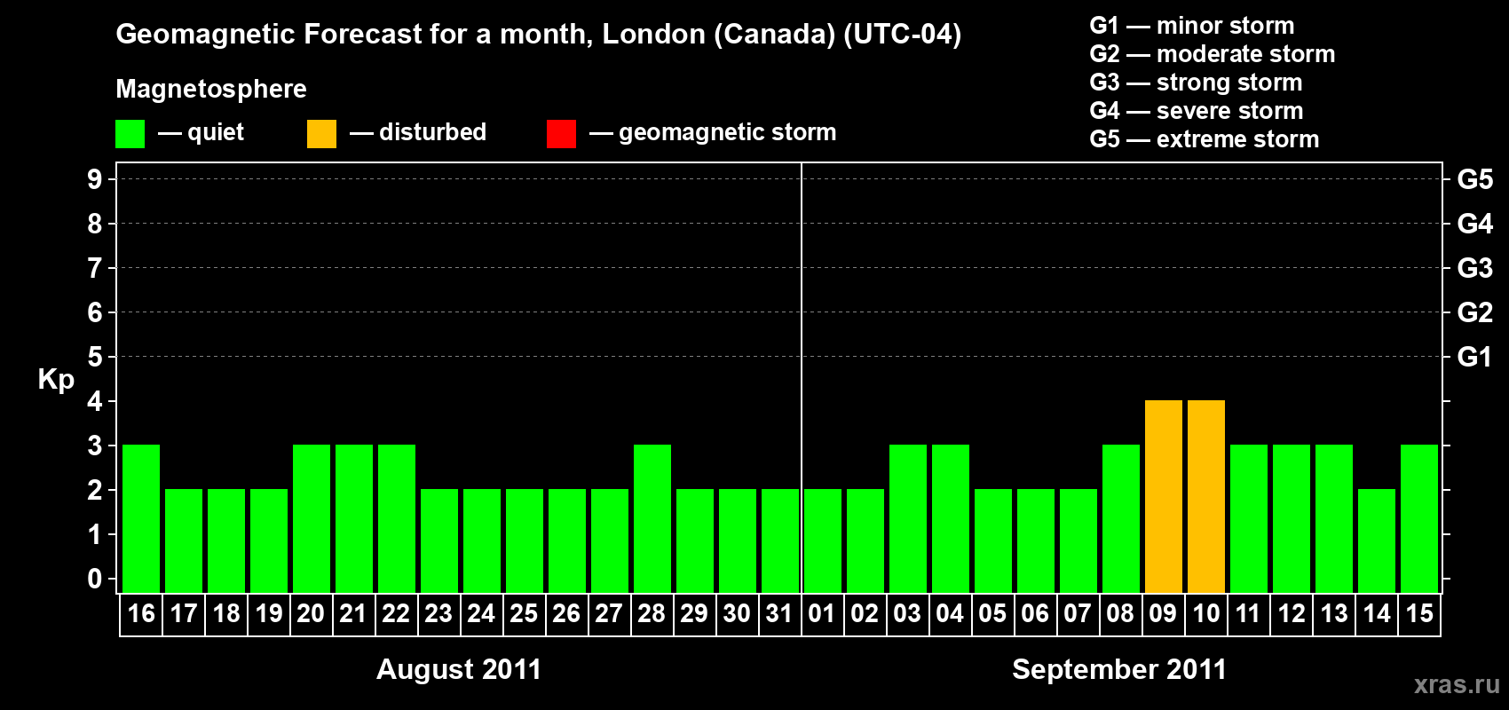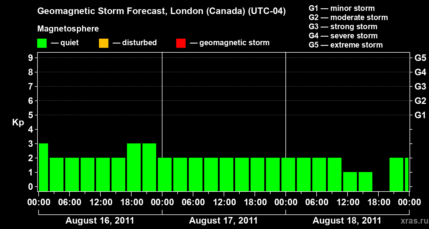 Geomagnetic storm forecast in London (Canada) for Aug 16, 2011