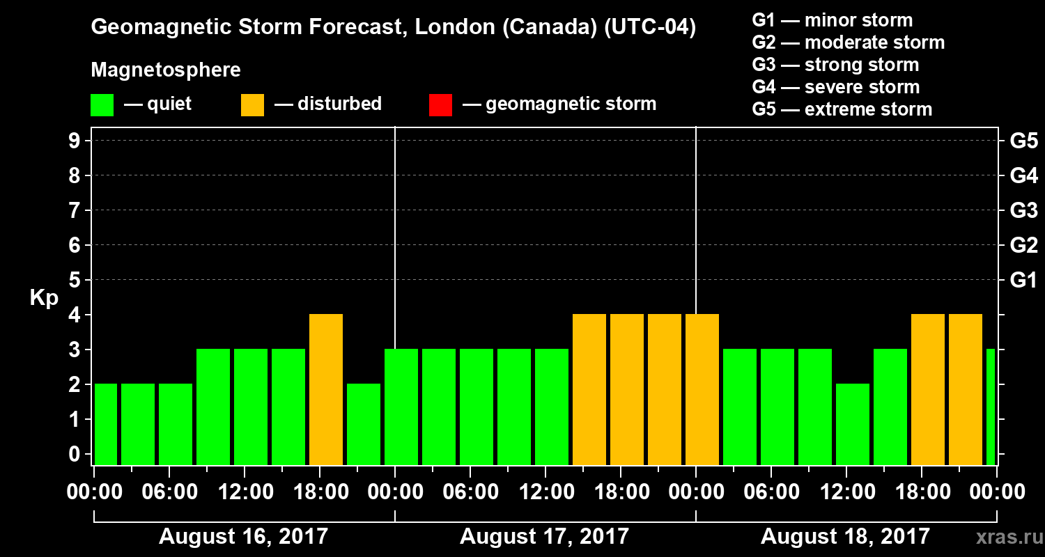 Geomagnetic storm forecast in London (Canada) for Aug 16, 2017