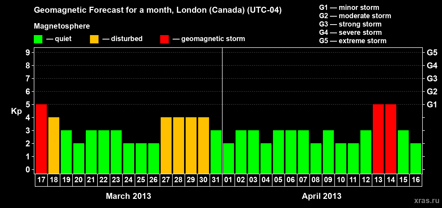Geomagnetic storm forecast in London (Canada) for Mar 17, 2013