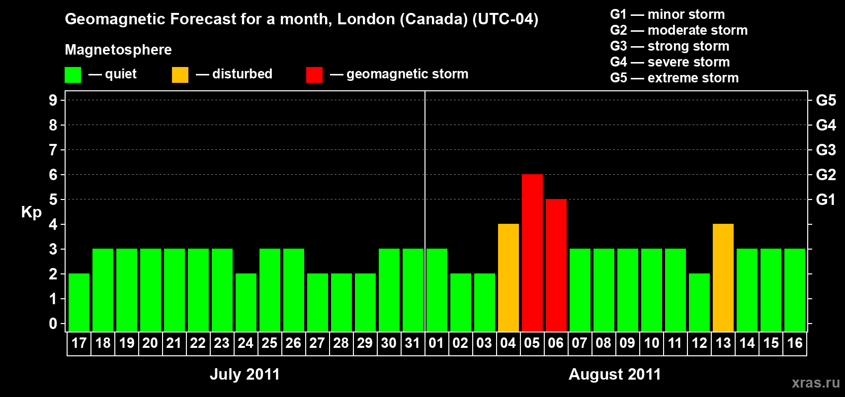 Geomagnetic storm forecast in London (Canada) for Jul 17, 2011