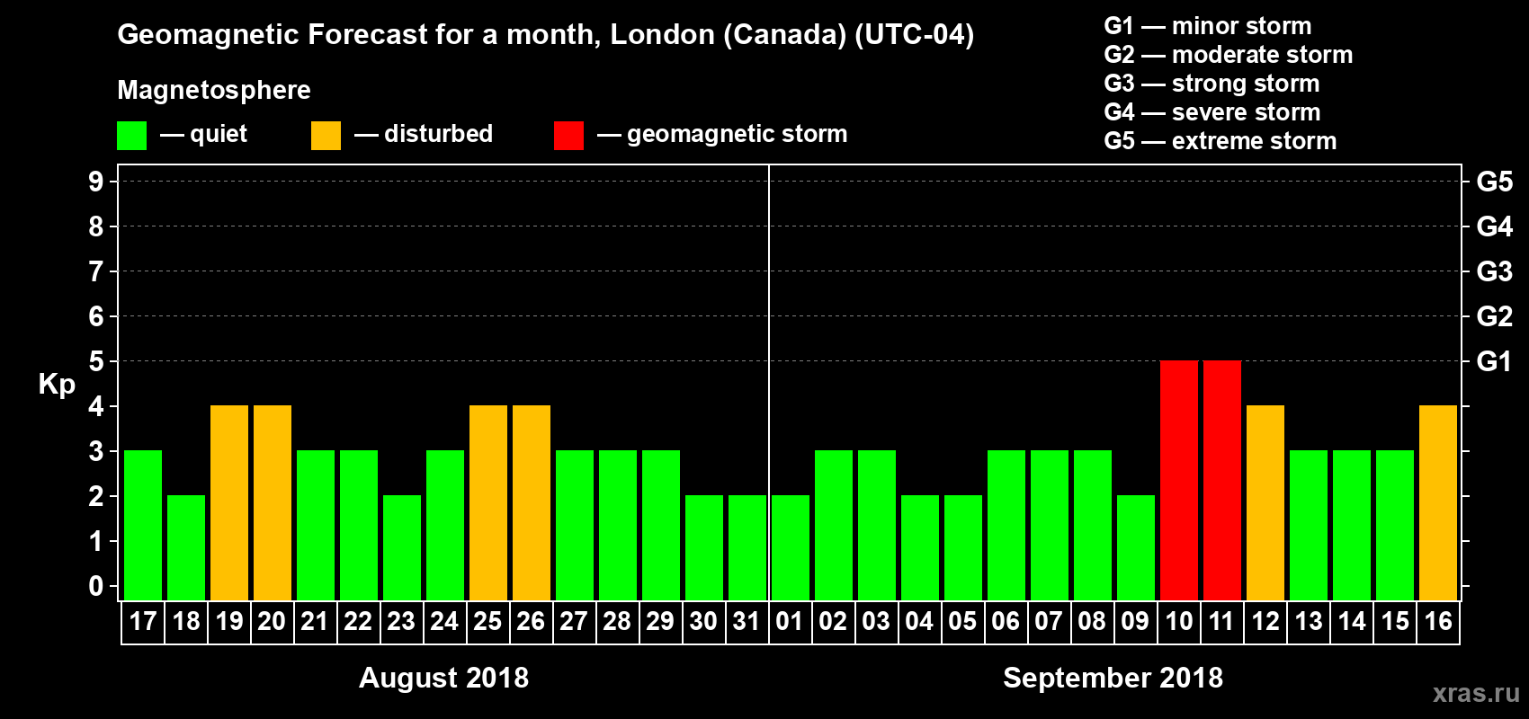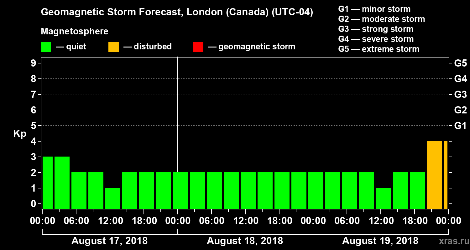 Geomagnetic storm forecast in London (Canada) for Aug 17, 2018