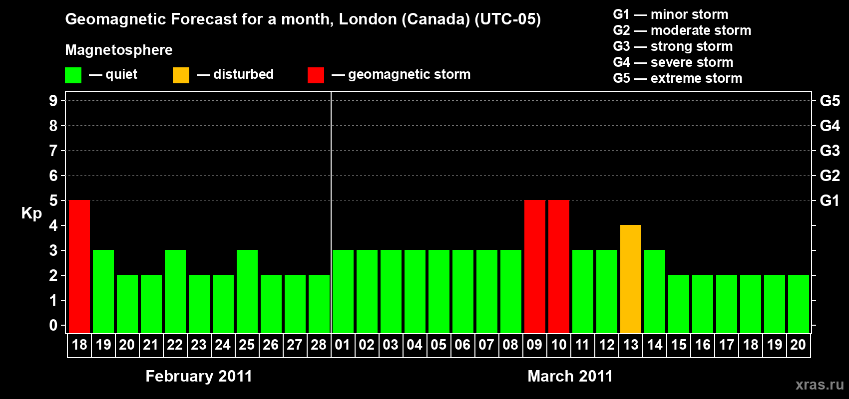 Geomagnetic storm forecast in London (Canada) for Feb 18, 2011