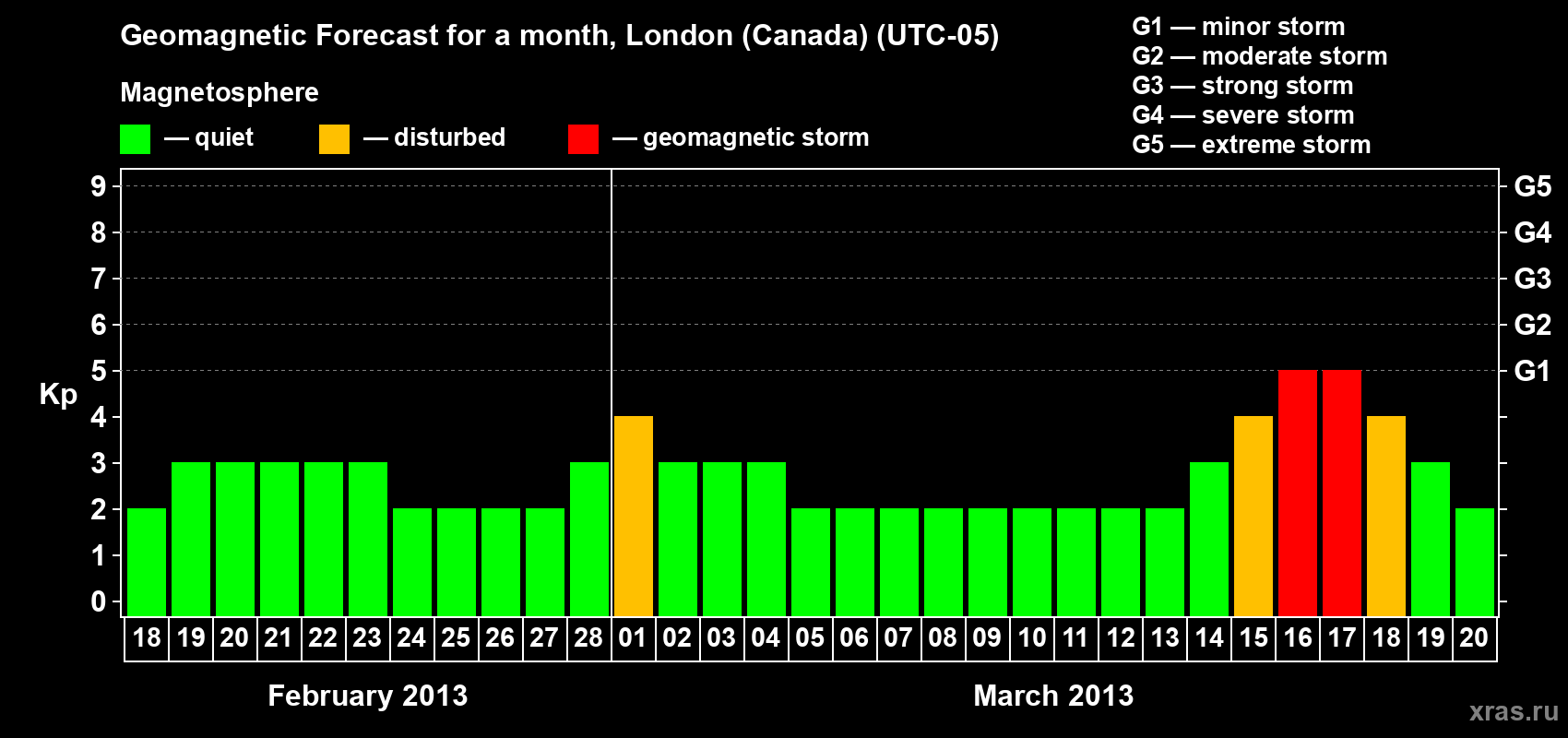 Geomagnetic storm forecast in London (Canada) for Feb 18, 2013