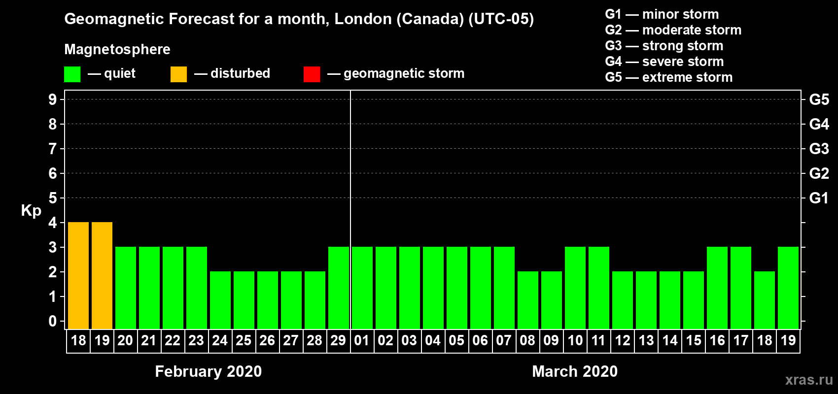 Geomagnetic storm forecast in London (Canada) for Feb 18, 2020