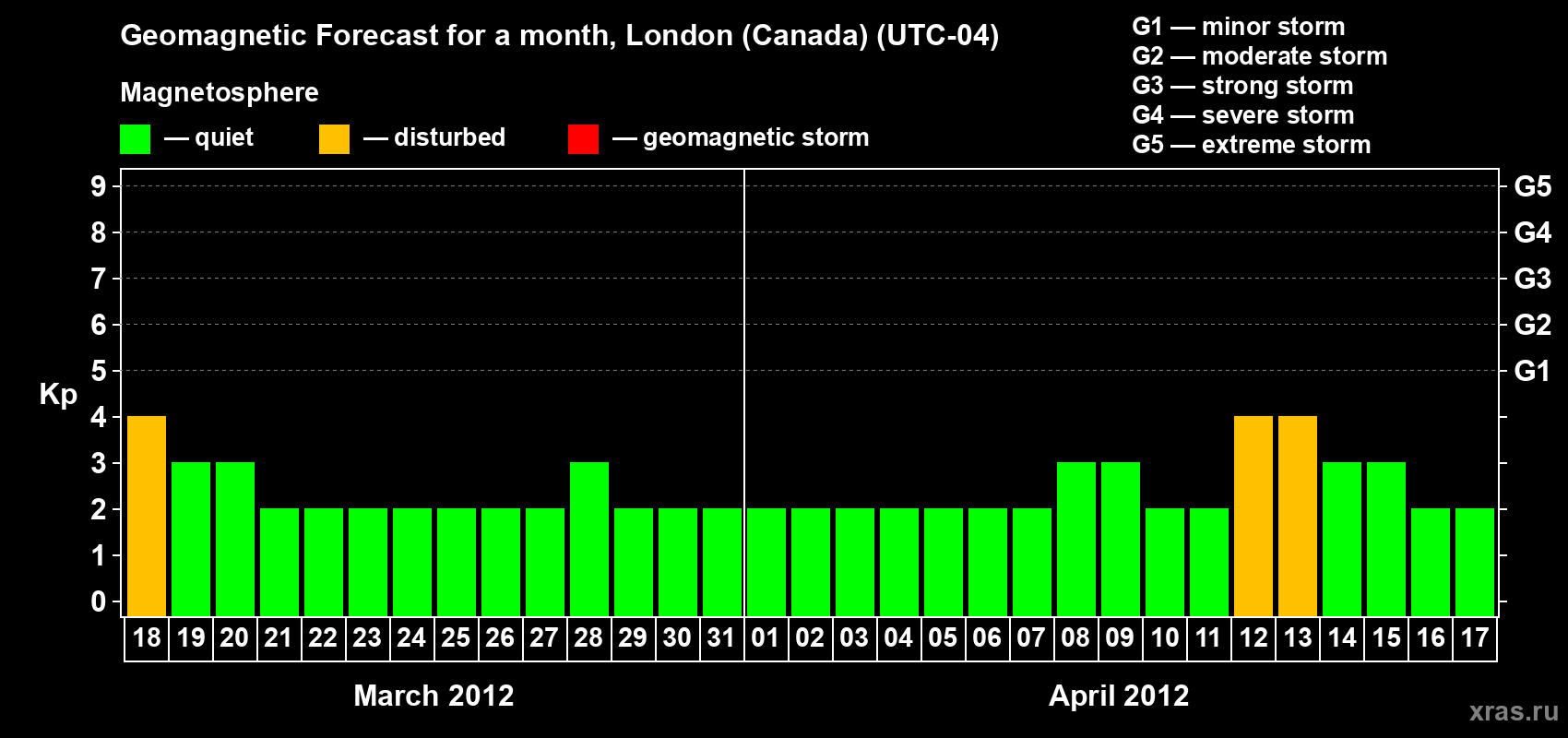 Geomagnetic storm forecast in London (Canada) for Mar 18, 2012