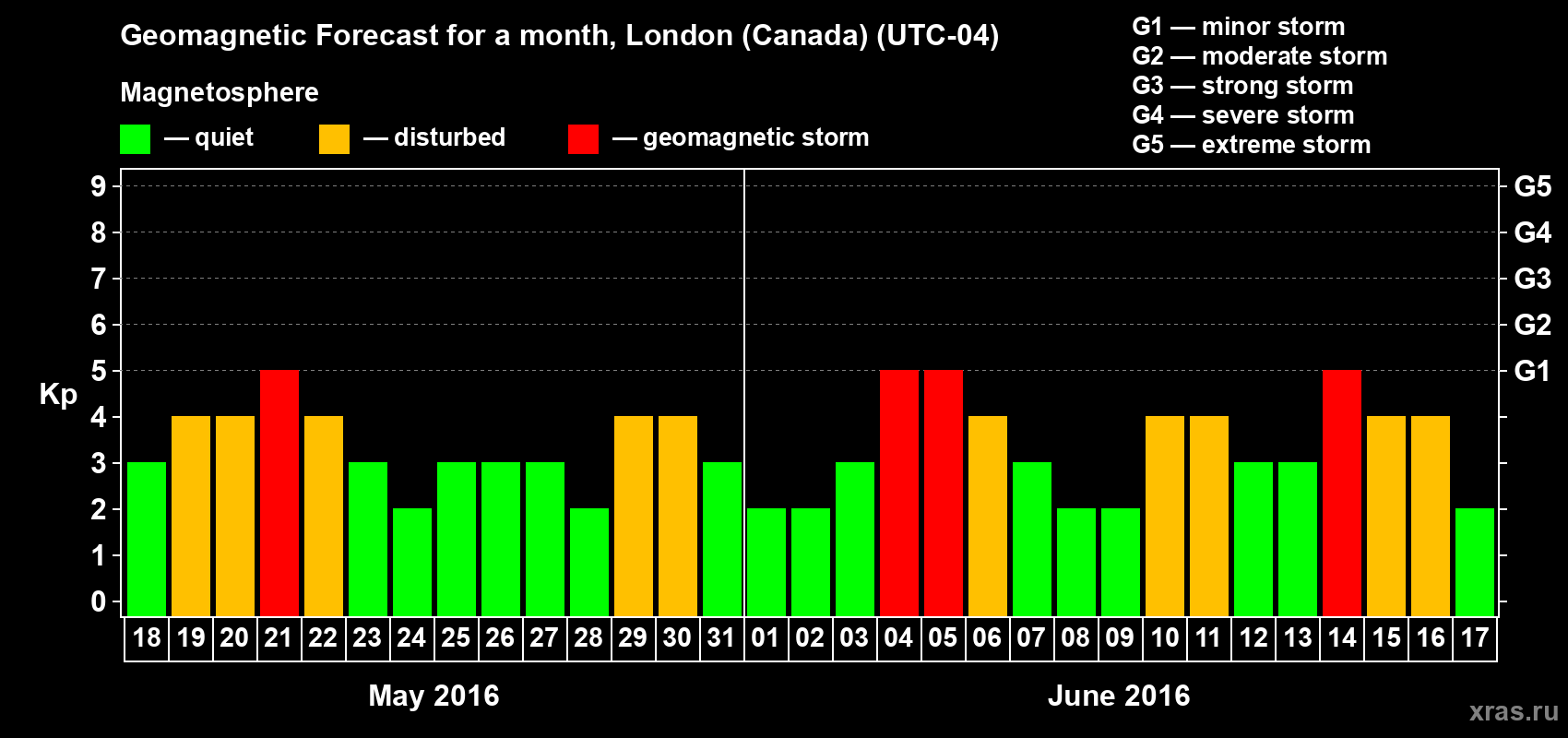 Geomagnetic storm forecast in London (Canada) for May 18, 2016