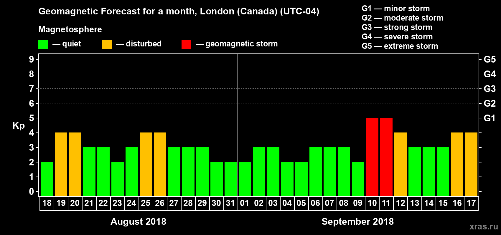 Geomagnetic storm forecast in London (Canada) for Aug 18, 2018