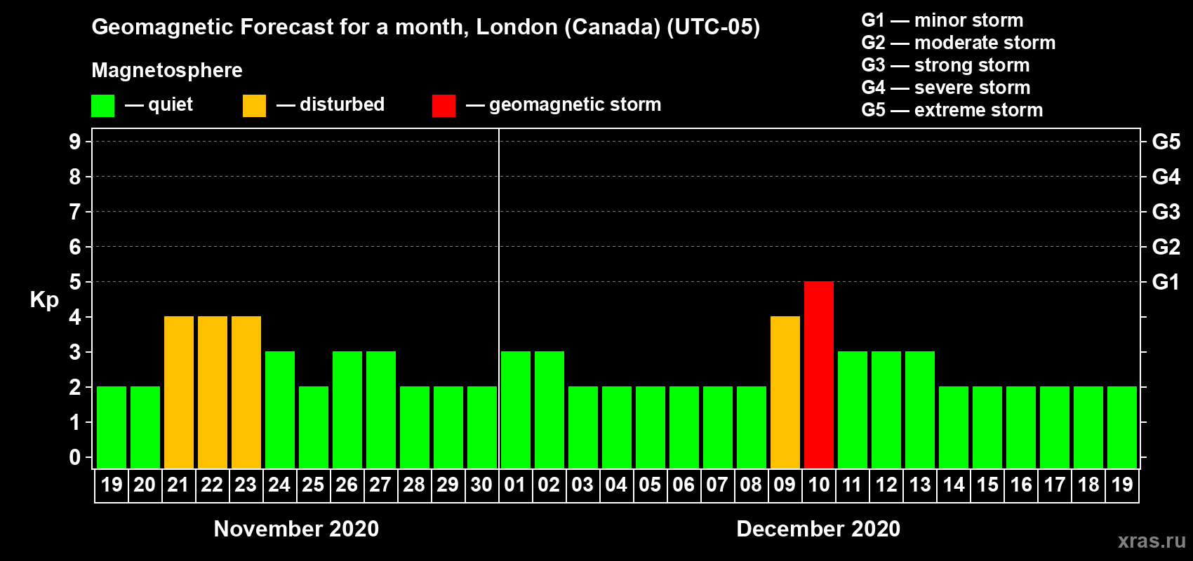 Geomagnetic storm forecast in London (Canada) for Nov 19, 2020