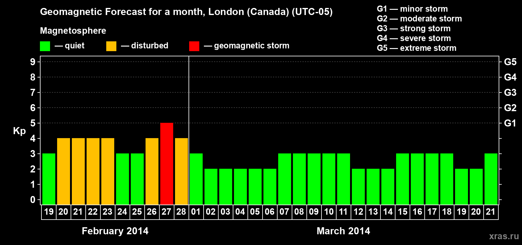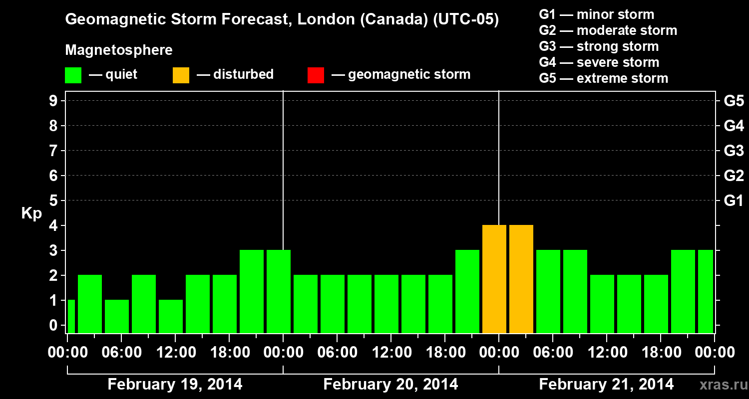 Geomagnetic storm forecast in London (Canada) for Feb 19, 2014