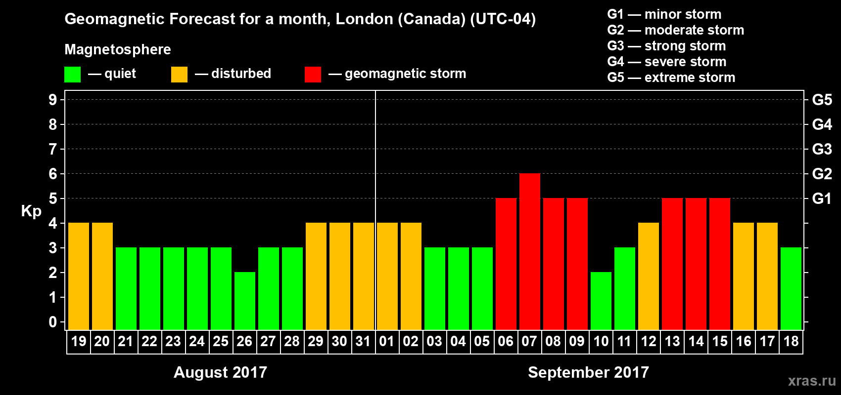 Geomagnetic storm forecast in London (Canada) for Aug 19, 2017