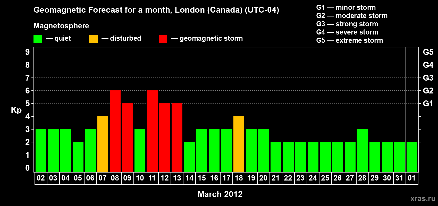 Geomagnetic storm forecast in London (Canada) for Mar 02, 2012