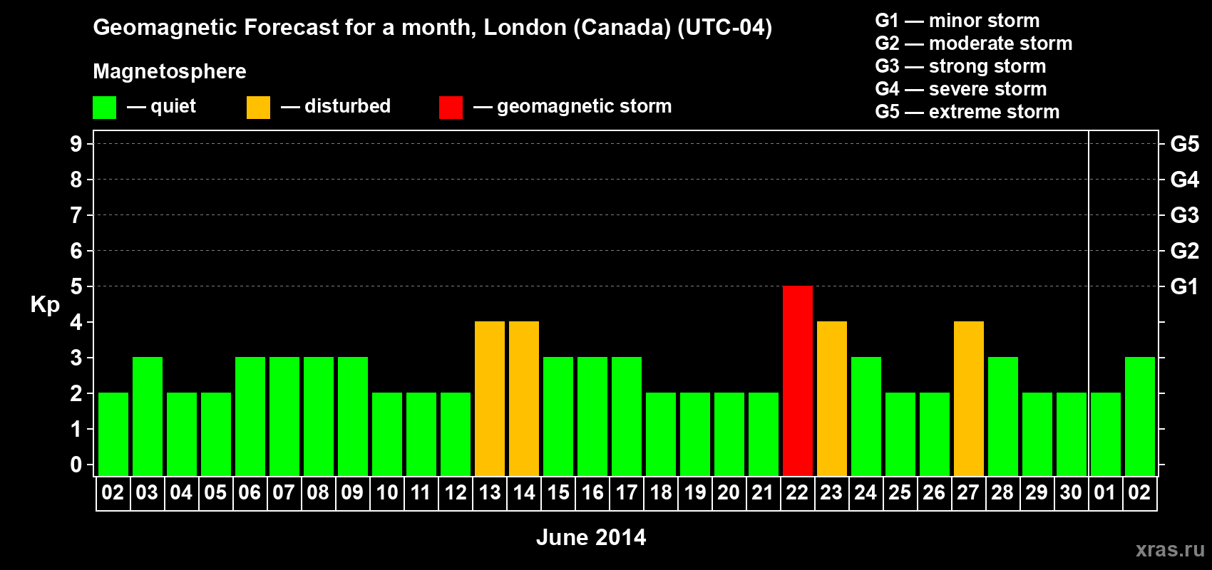 Geomagnetic storm forecast in London (Canada) for Jun 02, 2014