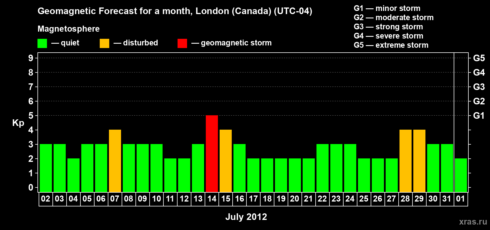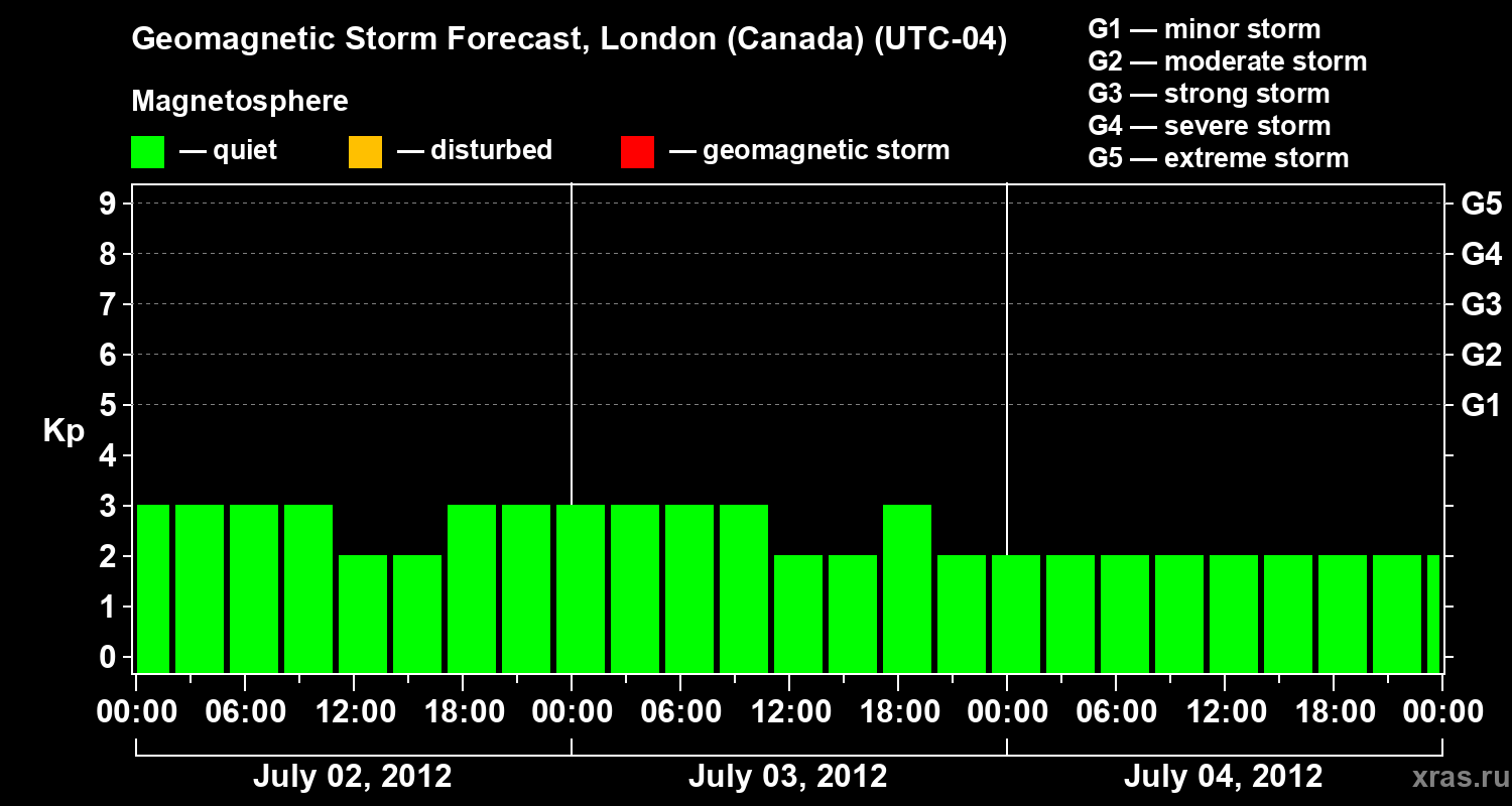 Geomagnetic storm forecast in London (Canada) for Jul 02, 2012