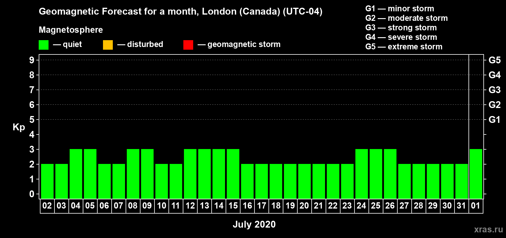 Geomagnetic storm forecast in London (Canada) for Jul 02, 2020