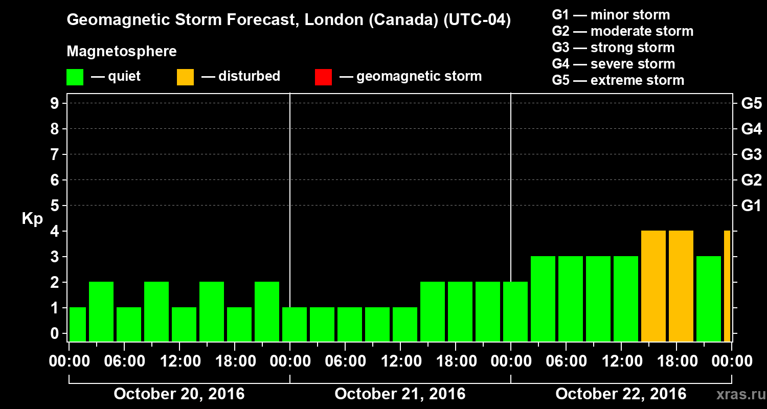 Geomagnetic storm forecast in London (Canada) for Oct 20, 2016