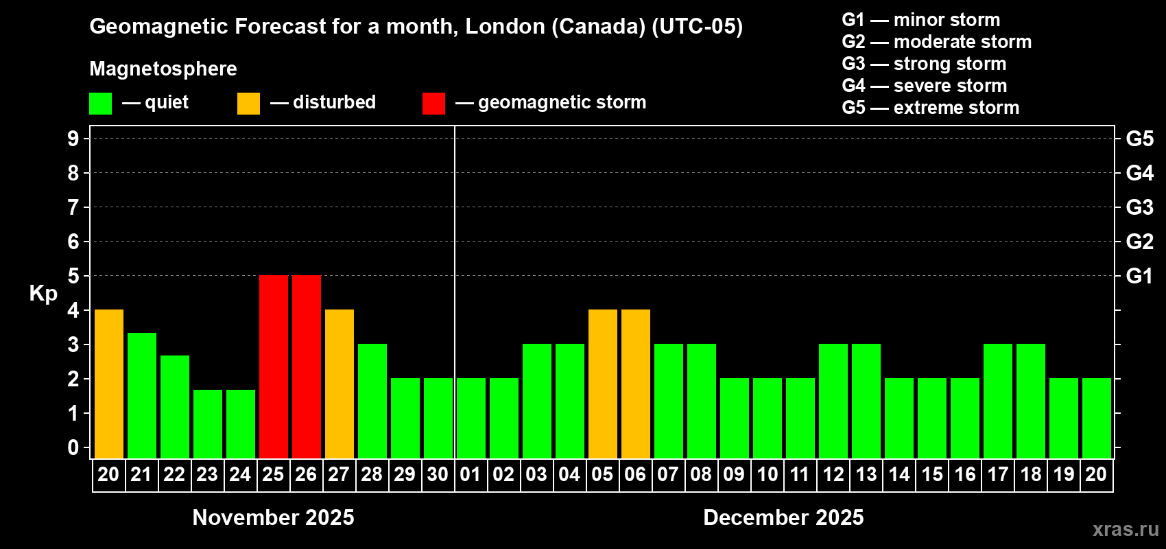 Geomagnetic storm forecast in London (Canada) for Nov 20, 2025