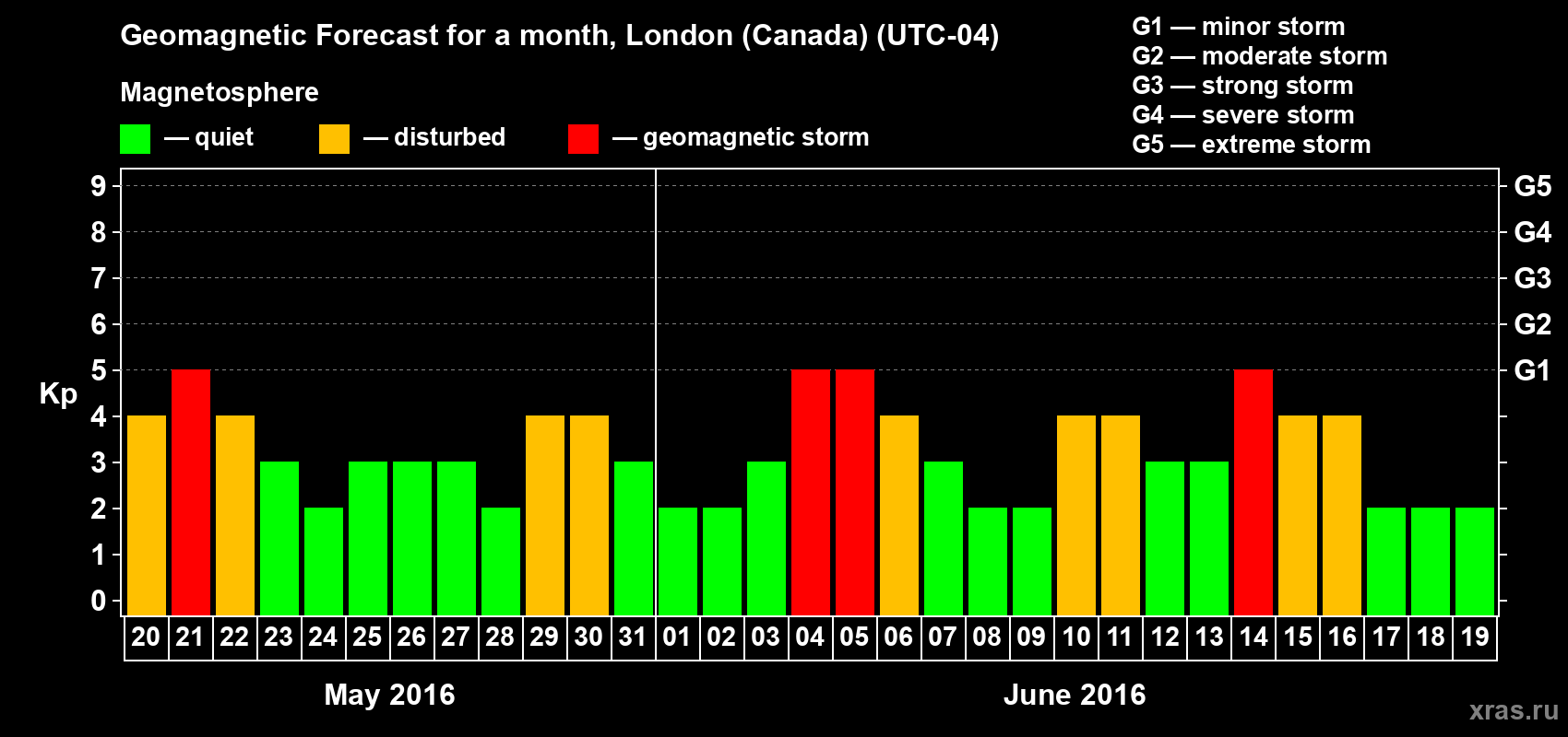 Geomagnetic storm forecast in London (Canada) for May 20, 2016