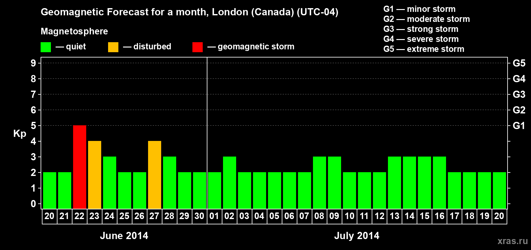 Geomagnetic storm forecast in London (Canada) for Jun 20, 2014
