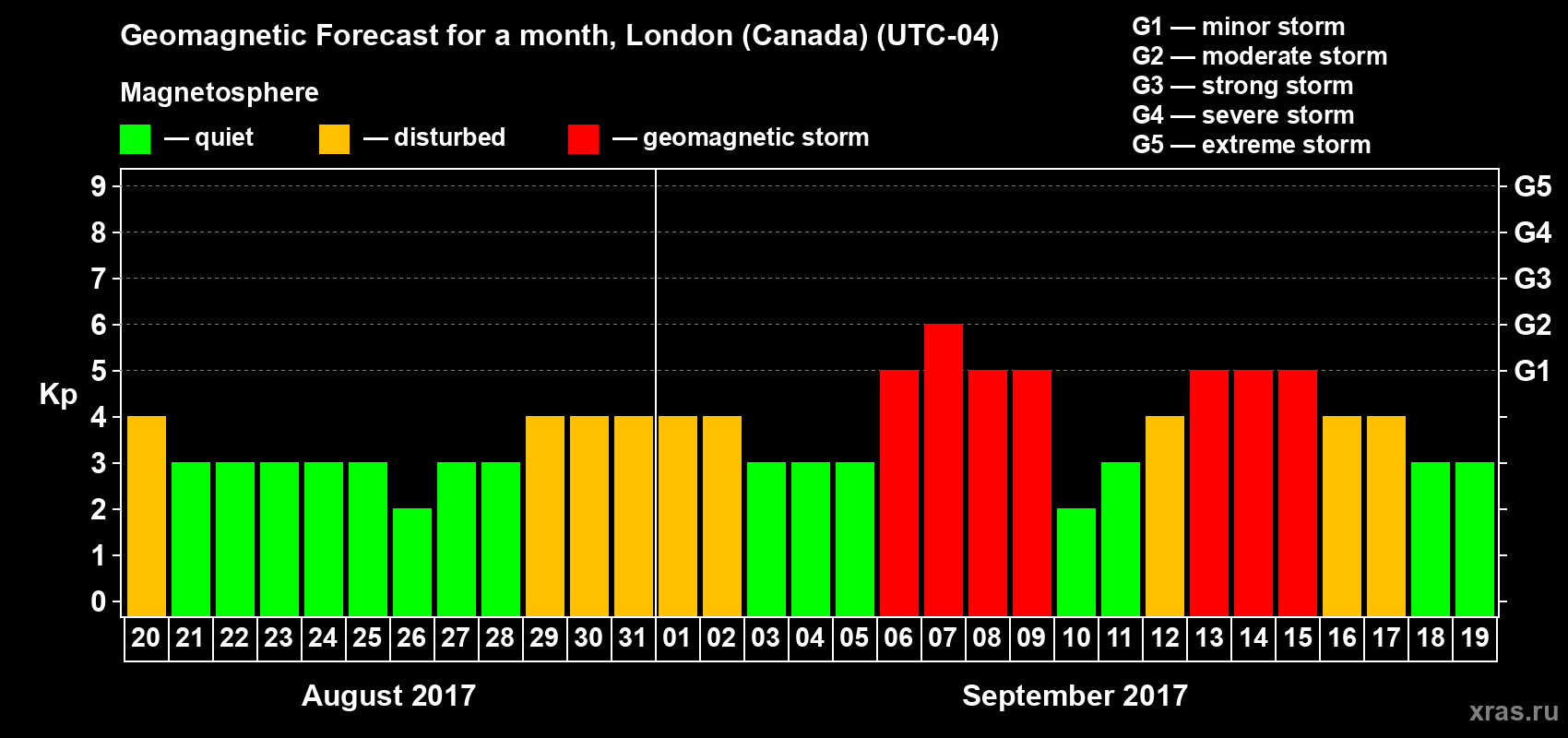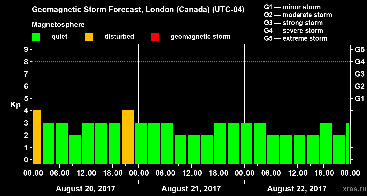 Geomagnetic storm forecast in London (Canada) for Aug 20, 2017