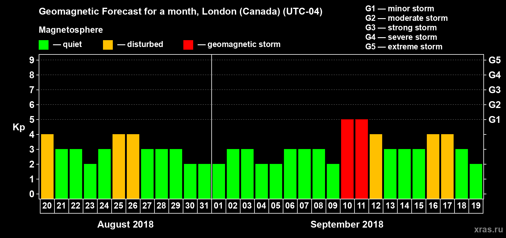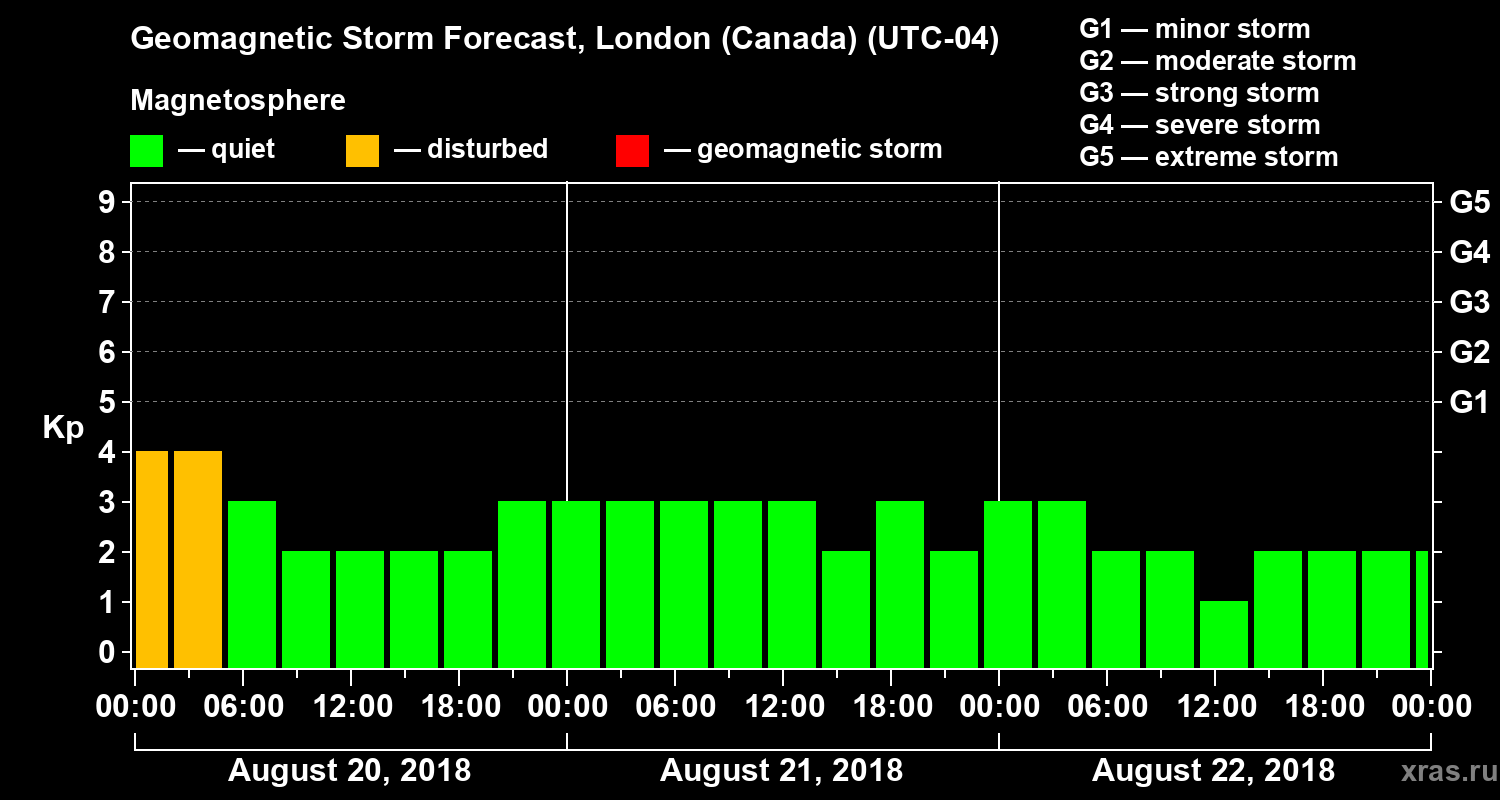 Geomagnetic storm forecast in London (Canada) for Aug 20, 2018