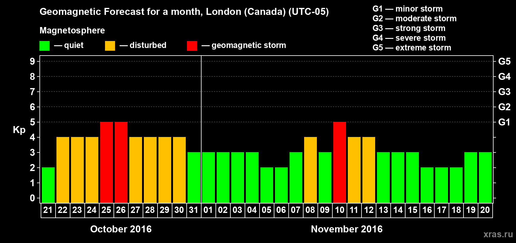 Geomagnetic storm forecast in London (Canada) for Oct 21, 2016