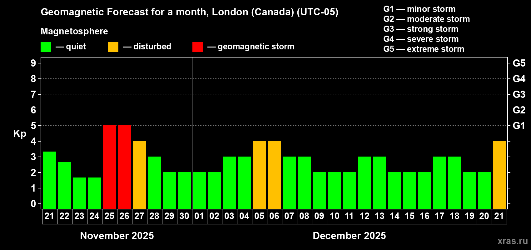 Geomagnetic storm forecast in London (Canada) for Nov 21, 2025