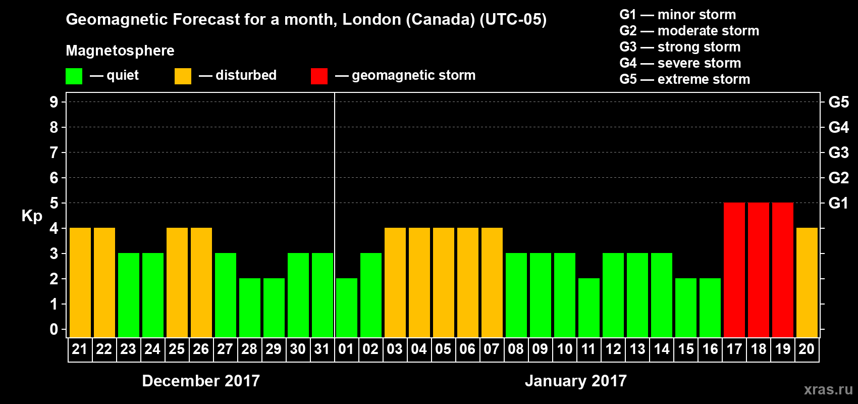Geomagnetic storm forecast in London (Canada) for Dec 21, 2016