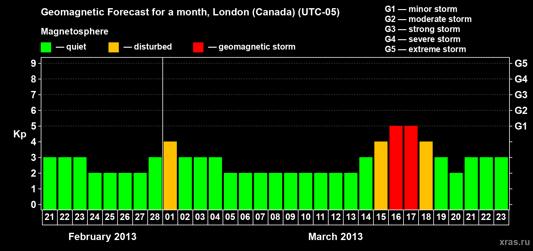 Geomagnetic storm forecast in London (Canada) for Feb 21, 2013