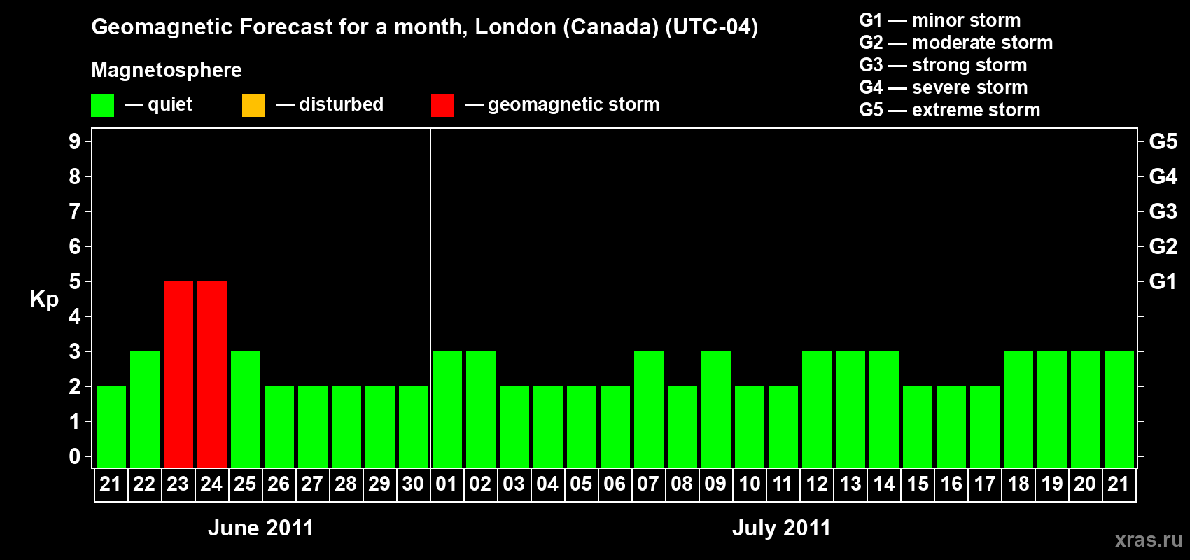 Geomagnetic storm forecast in London (Canada) for Jun 21, 2011