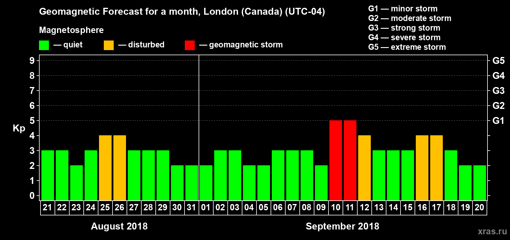 Geomagnetic storm forecast in London (Canada) for Aug 21, 2018
