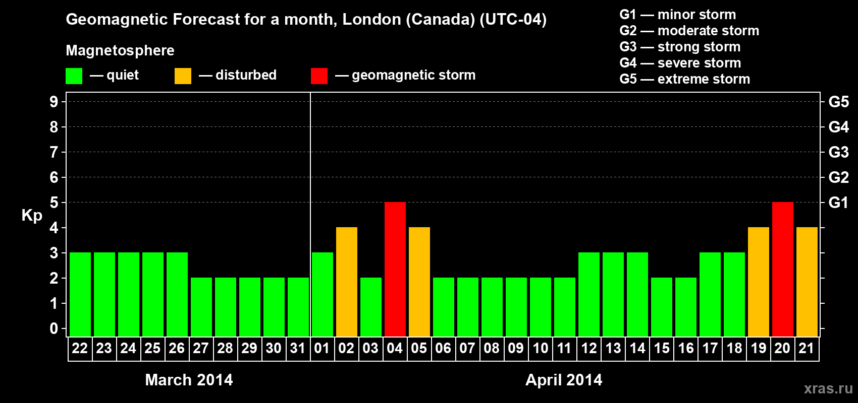 Geomagnetic storm forecast in London (Canada) for Mar 22, 2014