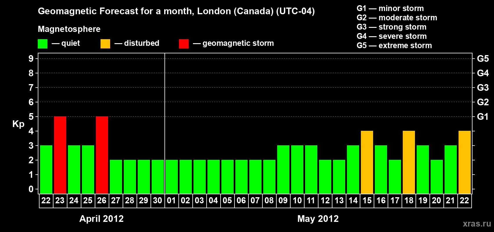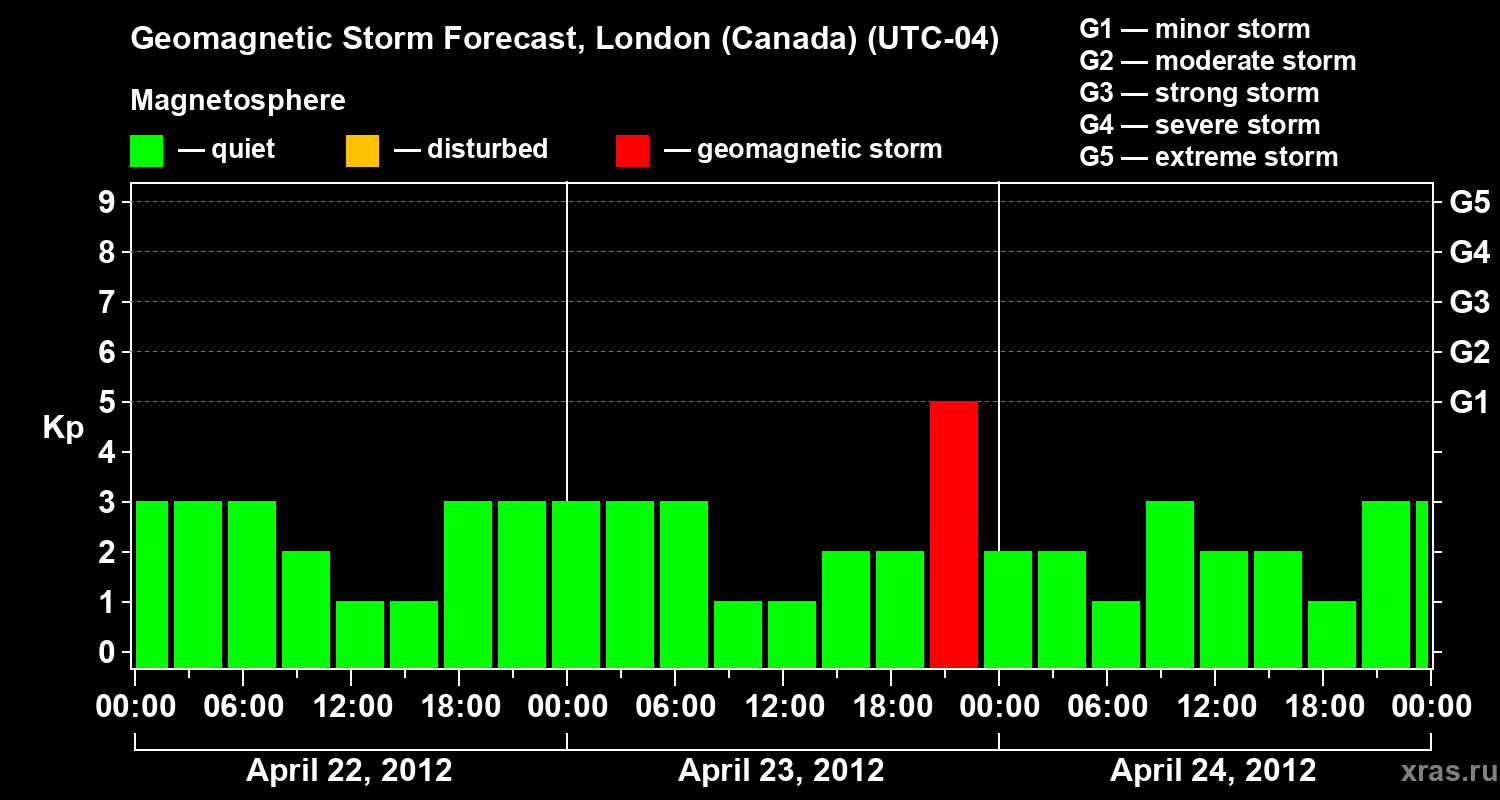 Geomagnetic storm forecast in London (Canada) for Apr 22, 2012