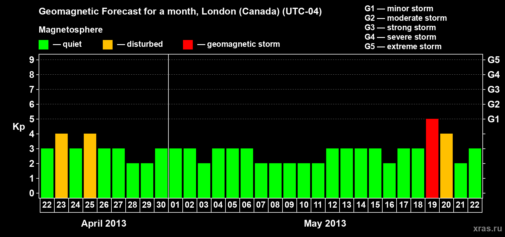 Geomagnetic storm forecast in London (Canada) for Apr 22, 2013
