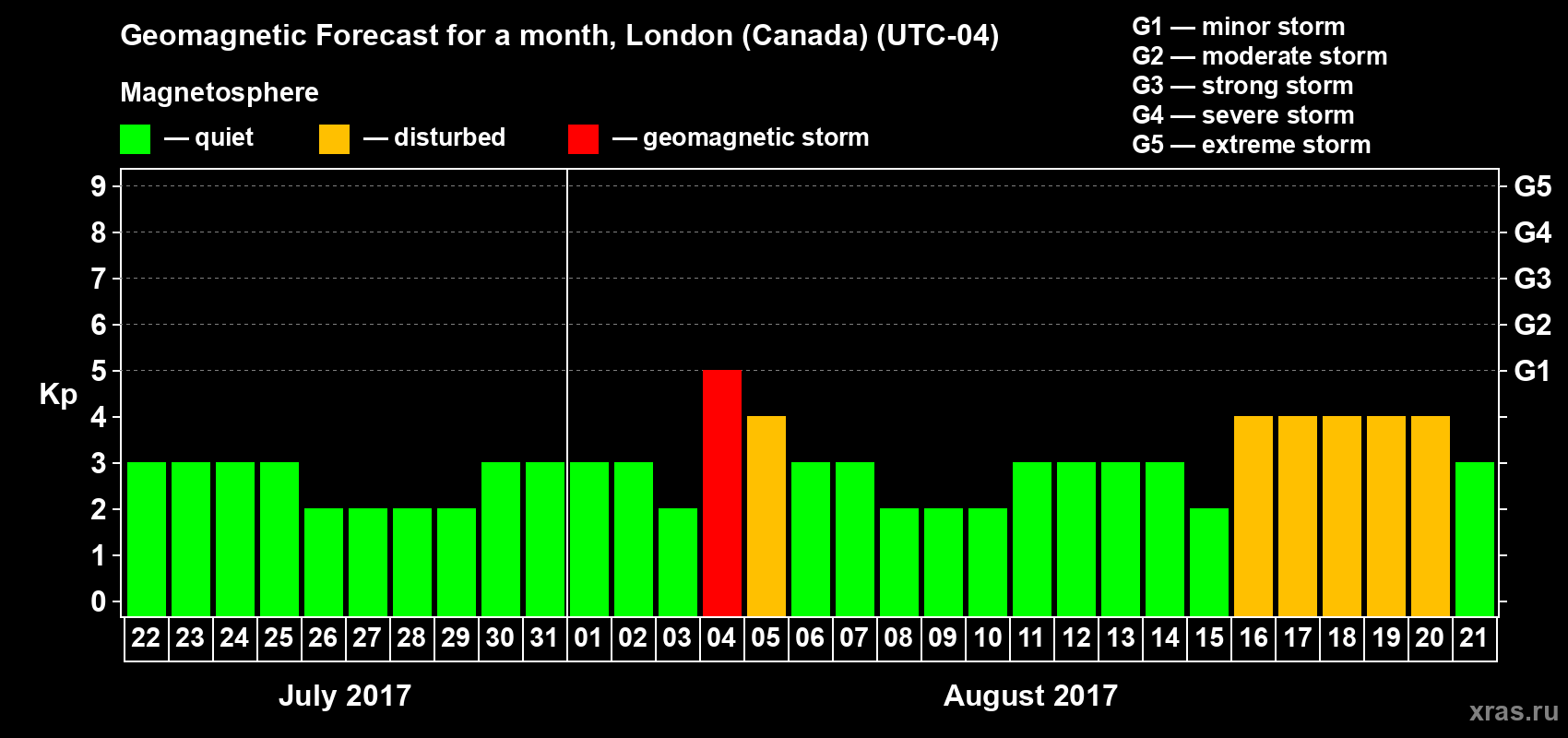 Geomagnetic storm forecast in London (Canada) for Jul 22, 2017