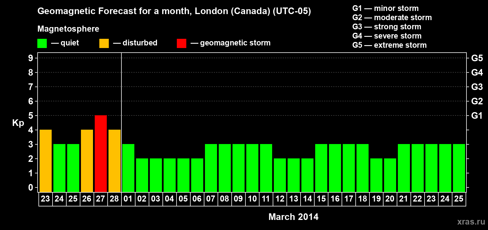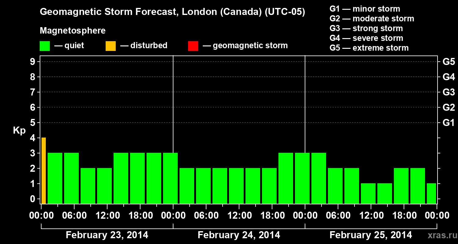 Geomagnetic storm forecast in London (Canada) for Feb 23, 2014