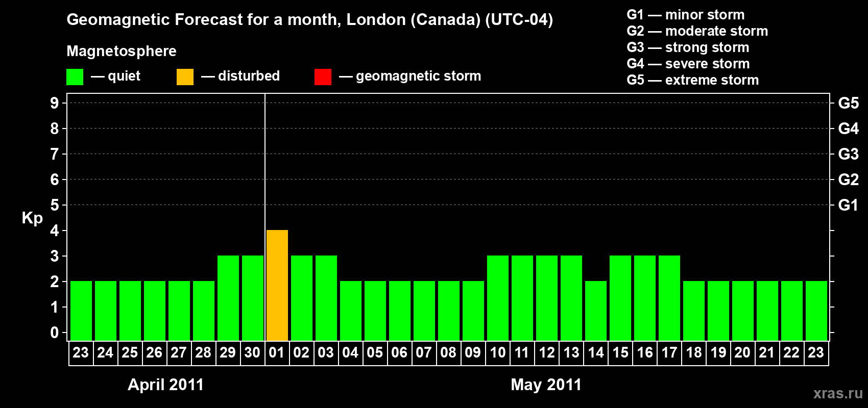 Geomagnetic storm forecast in London (Canada) for Apr 23, 2011