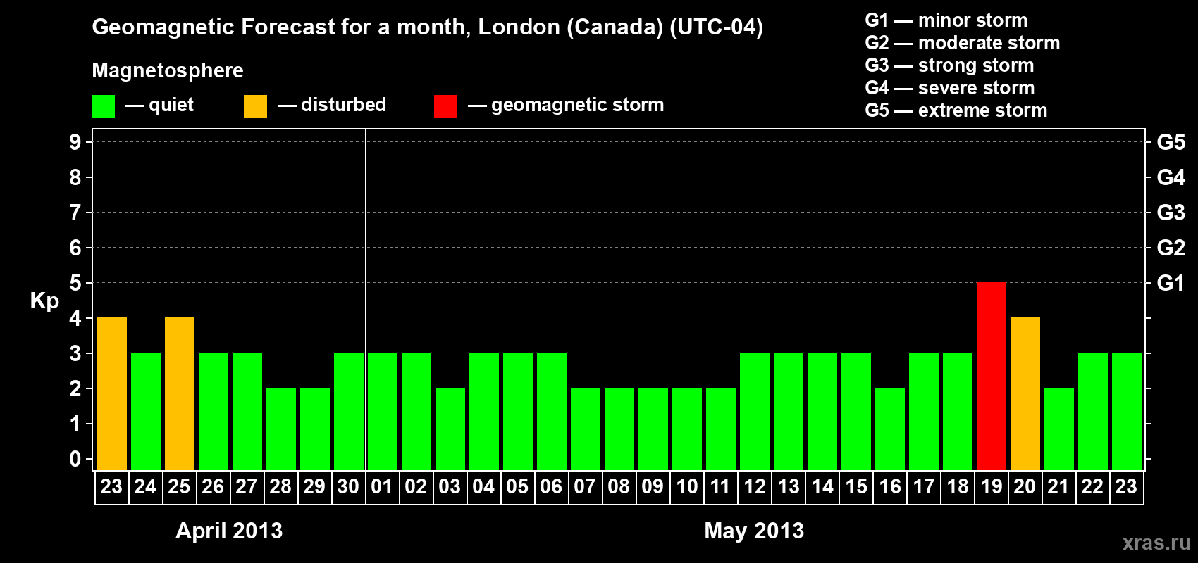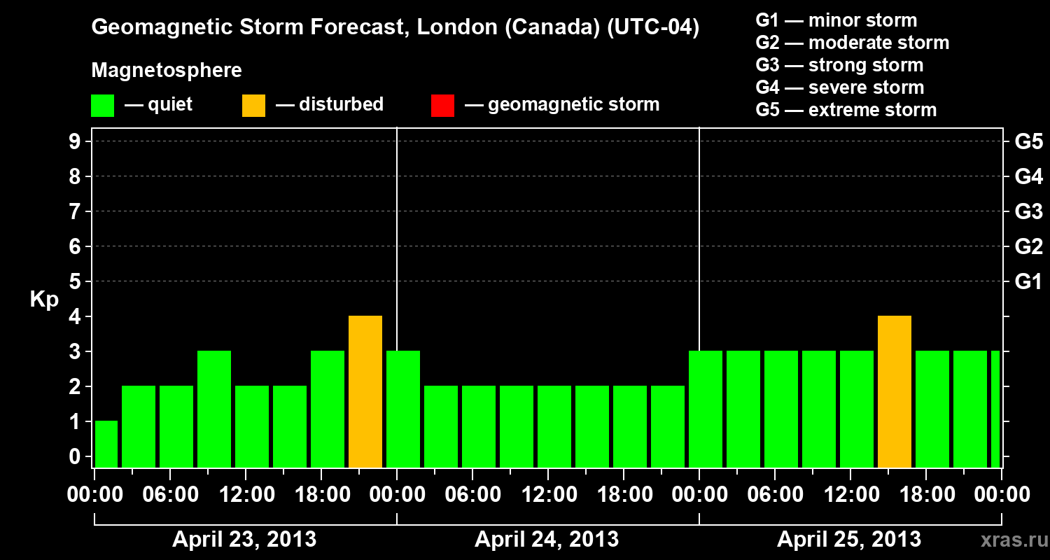 Geomagnetic storm forecast in London (Canada) for Apr 23, 2013